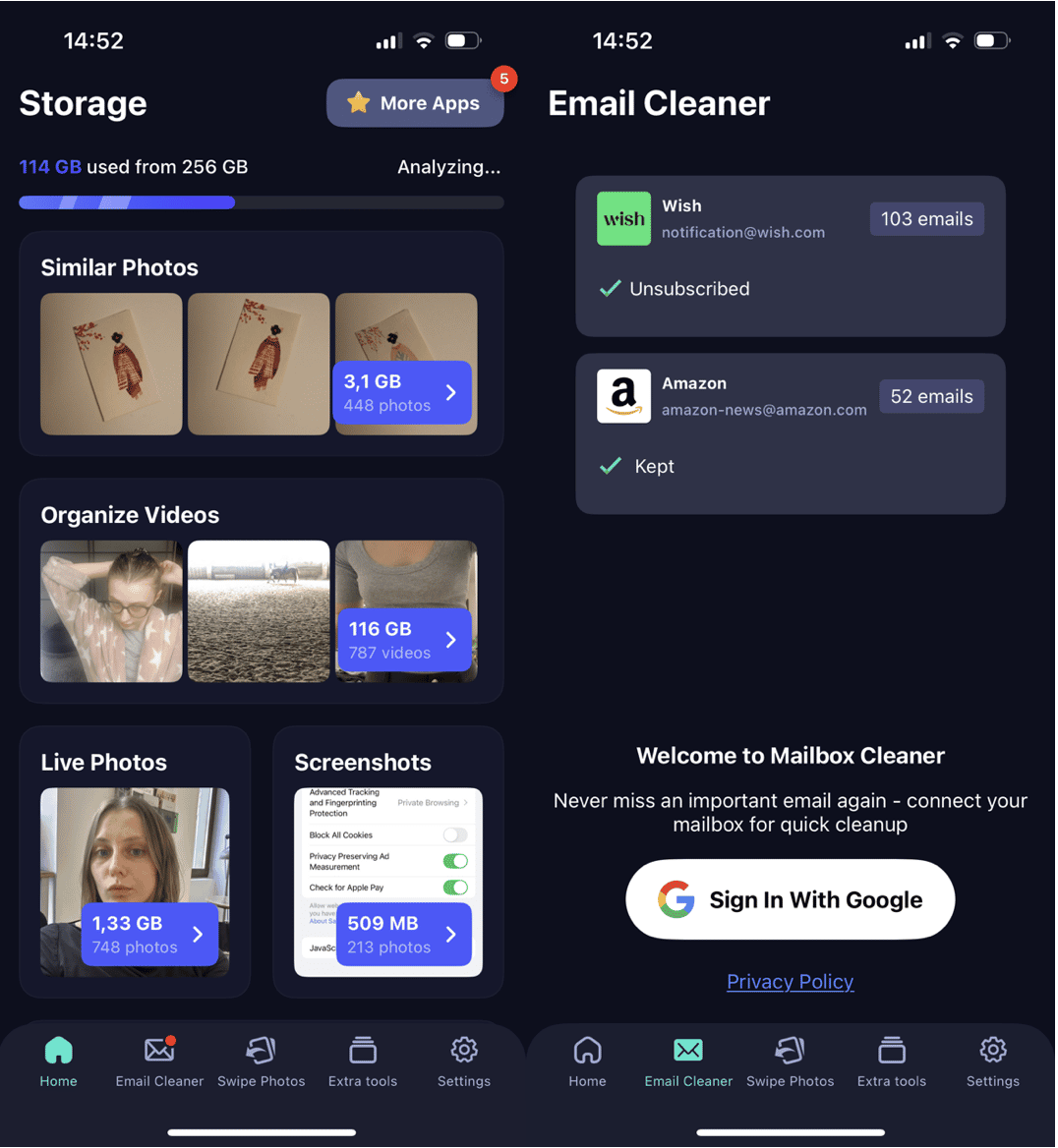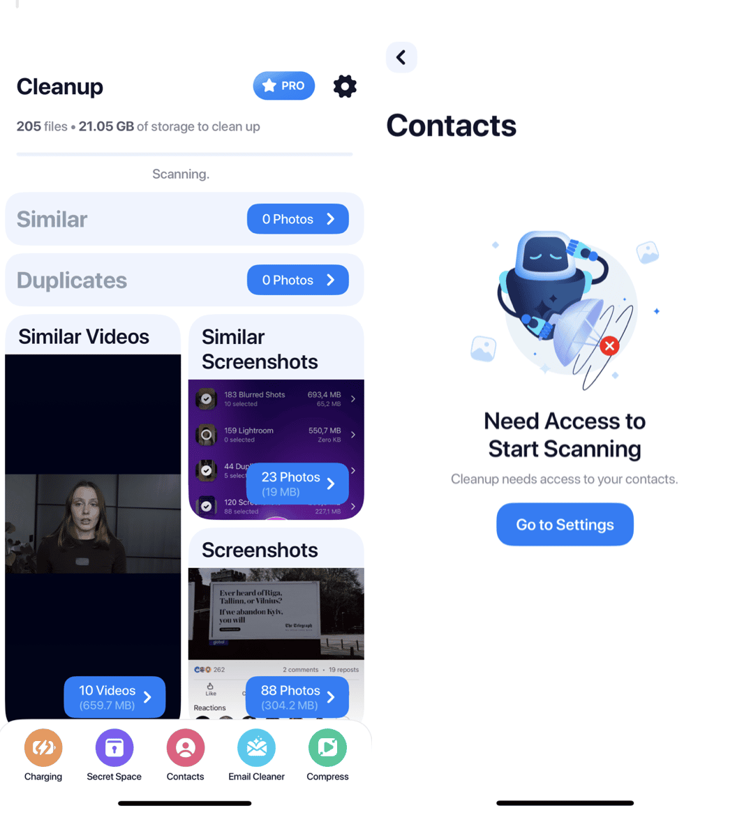 Cleanup is a relatively well-known tool with some big capabilities. This app can tidy up your contacts, photos, and emails. You can browse photo removal recommendations, use completely offline, and enjoy different subscription options.