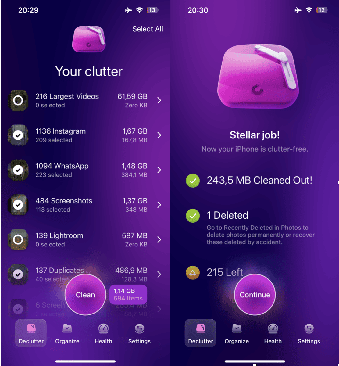 Launch the app and select Declutter to sweep for large videos, screenshots, and duplicates.