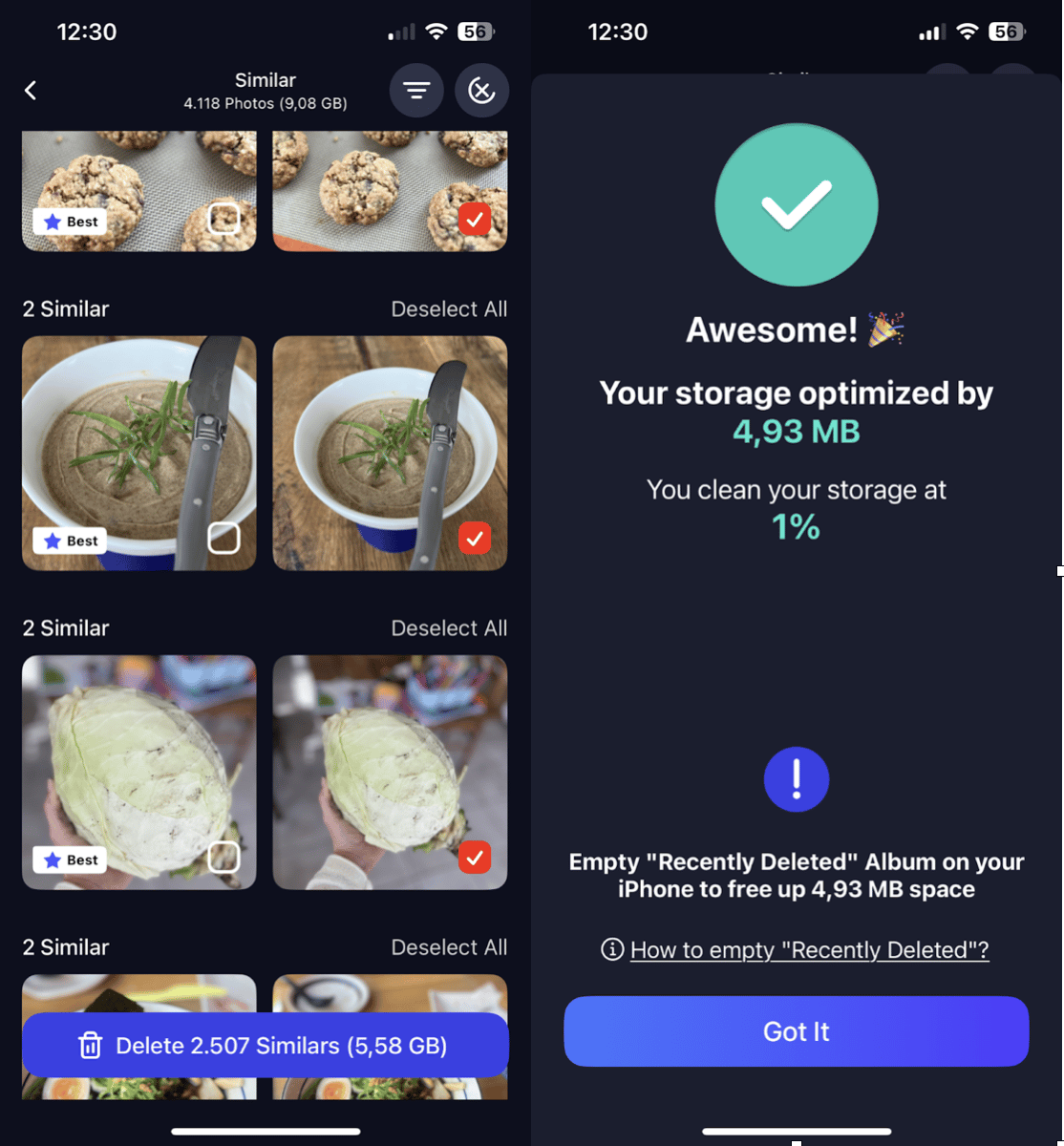 This was the first tool I tested, and it does what you expect: scans your photo library for duplicates and near-duplicates, then groups them. It highlights the "best" version to keep based on clarity and size. It's not 100% perfect. I found that some image groups weren't true duplicates, but they were good enough to cut down real space fast.