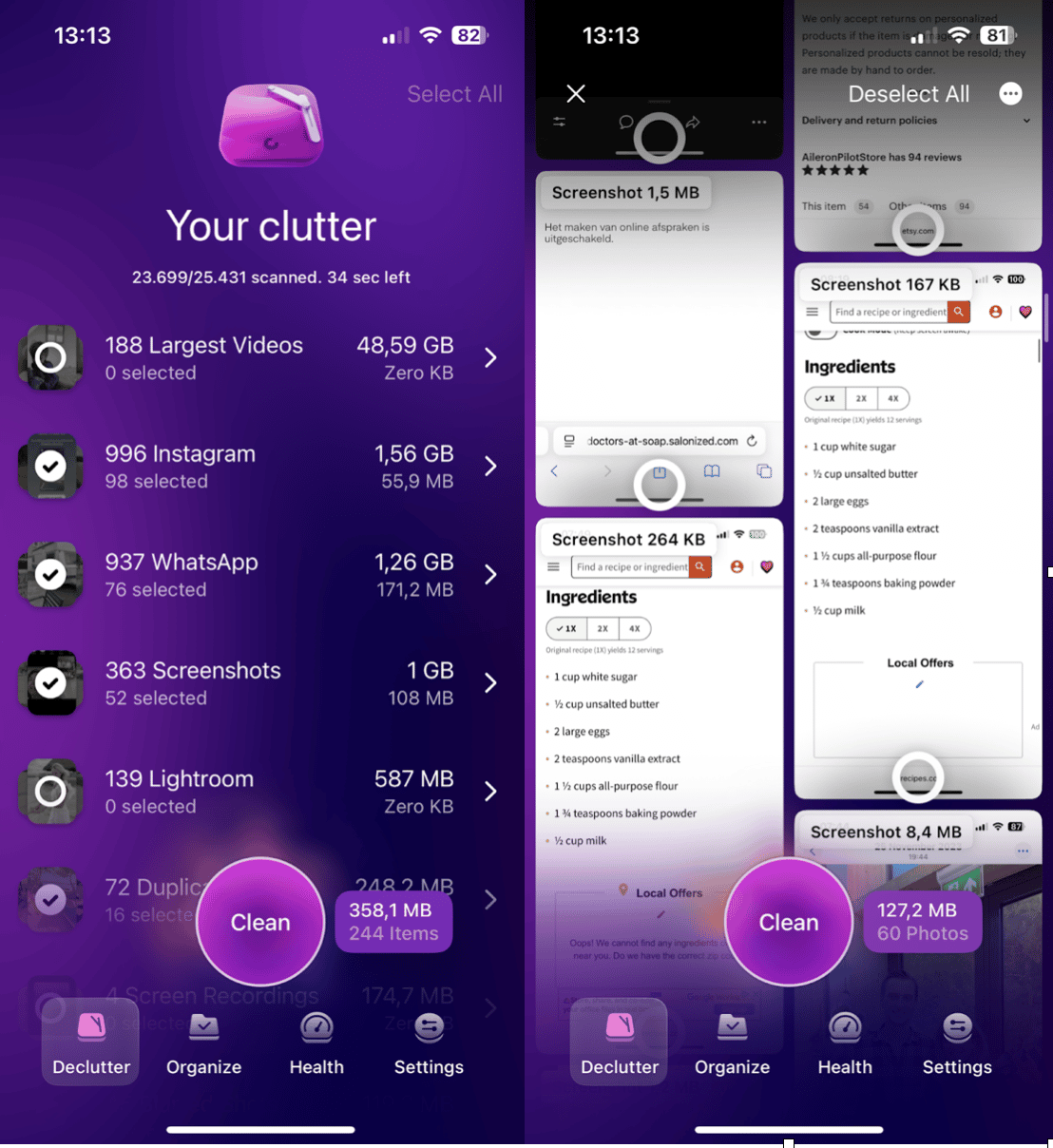 Clearing all your Google cache is a great start, but it’s not the only type of clutter hogging space. I found that old screenshots and duplicate photos were taking up more storage than expected, especially after years of daily use. That’s where CleanMy®Phone’s Declutter tool comes in handy. It scans for: