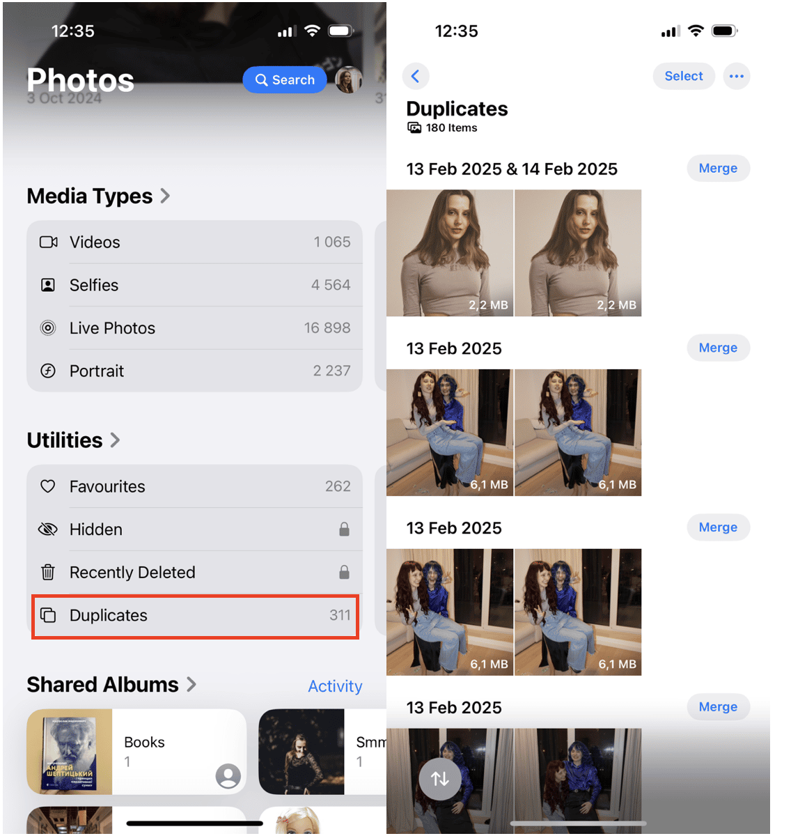Or tap Select (top right) to choose multiple duplicates at once, then merge them all together.