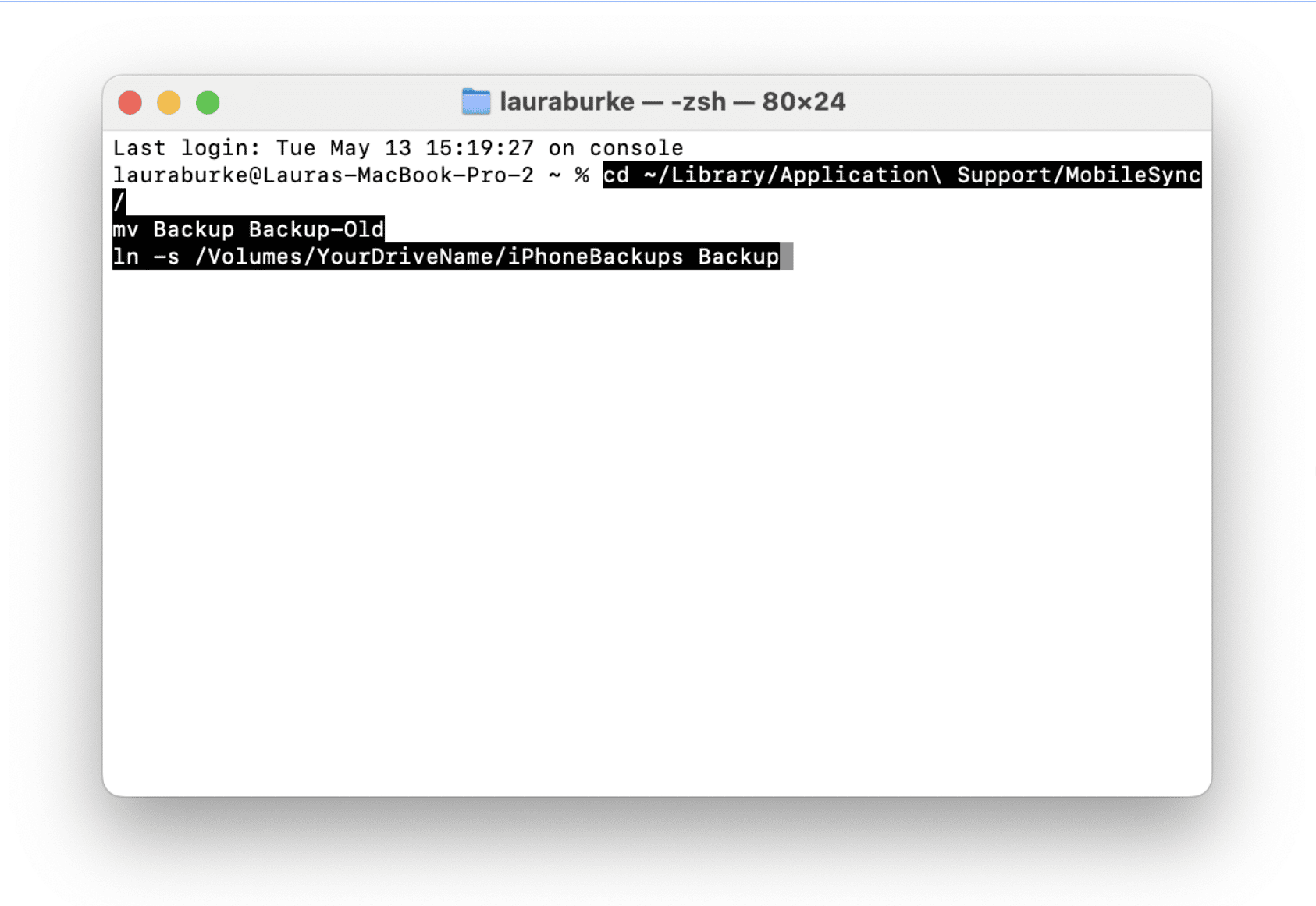 Replace the bit in the string above where it says YourDriveName with the actual name of your external hard drive.