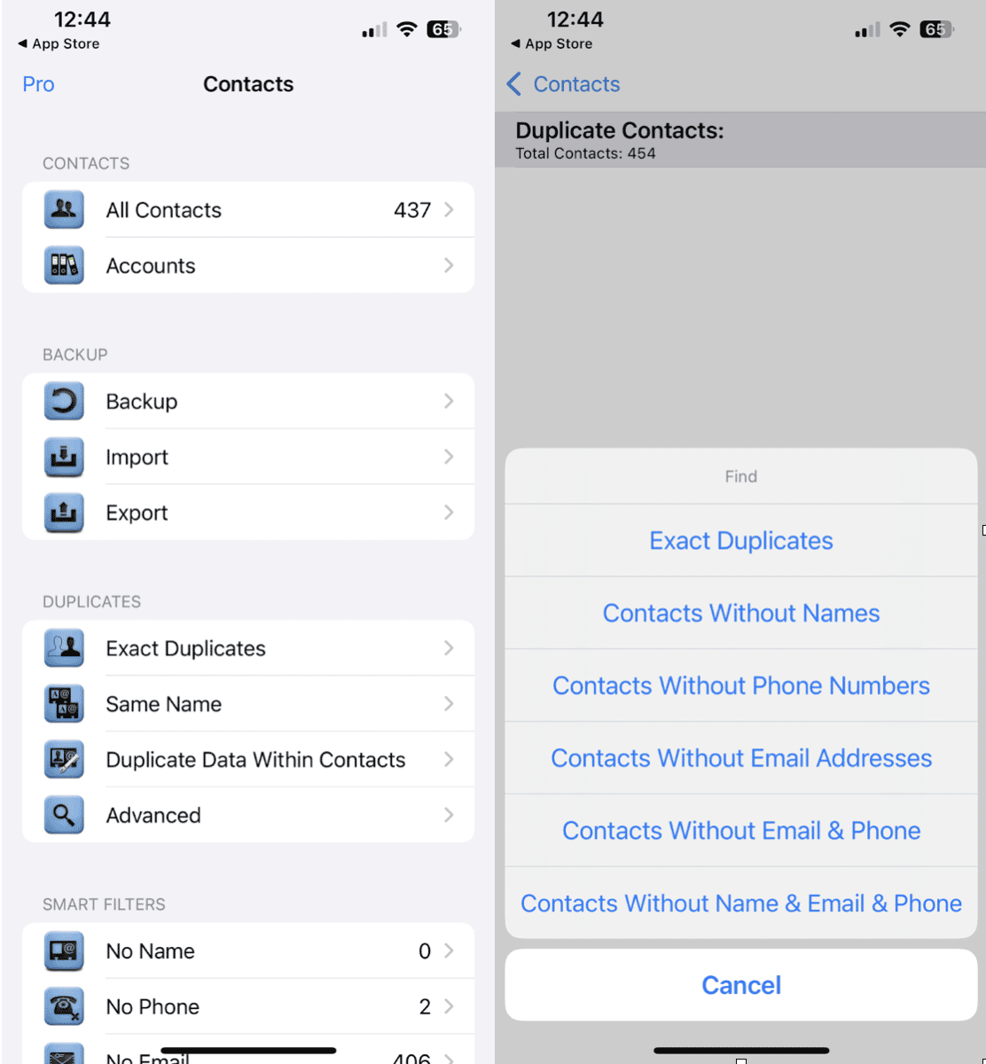 So, this tool really is a no-frills iPhone app that quickly finds exact duplicates and empty cards (no name/number) and lets you merge or delete them in a couple of taps.
