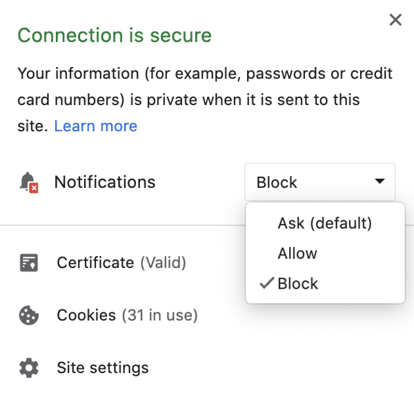 - Choose Block from the drop-down list to disable notifications for this site.