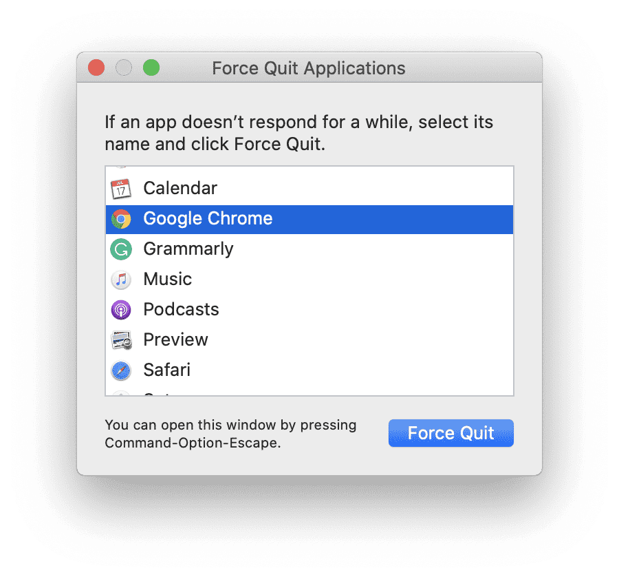 Select the name of the frozen application from the menu’s list and click Force Quit. This should cause the program to close.