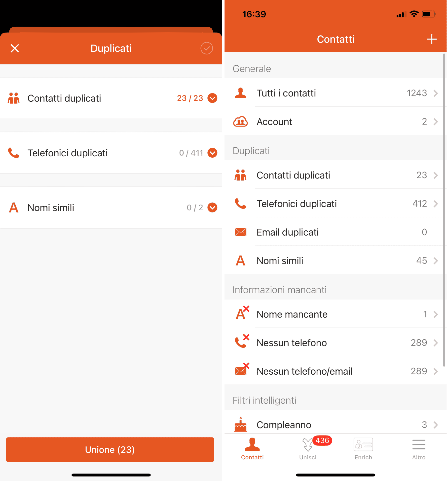 È possibile scegliere di unire o rimuovere i duplicati e inserire le informazioni di contatto mancanti.